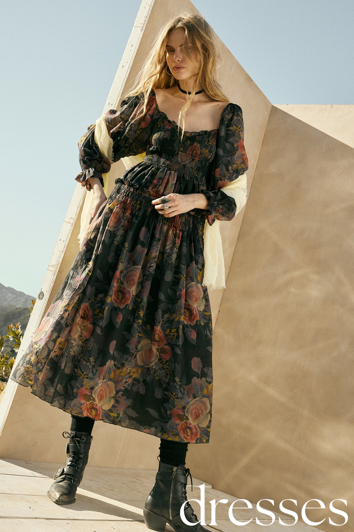 Chestnut Roses Smocked Floral Midi Peasant Dress