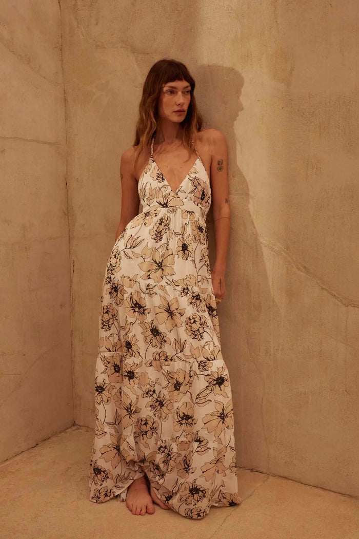 Blown Away Floral Crepe Tiered Halter Maxi Dress