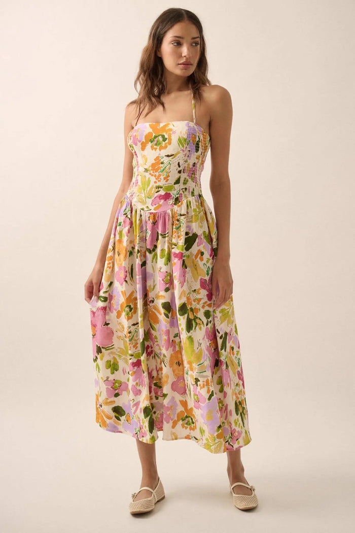 Artsy Blossoms Floral Paneled Halter Maxi Dress