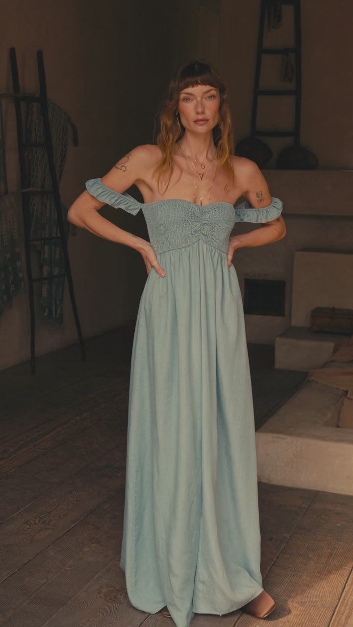 Cloud Nine Smocked Denim Off-Shoulder Maxi Dress