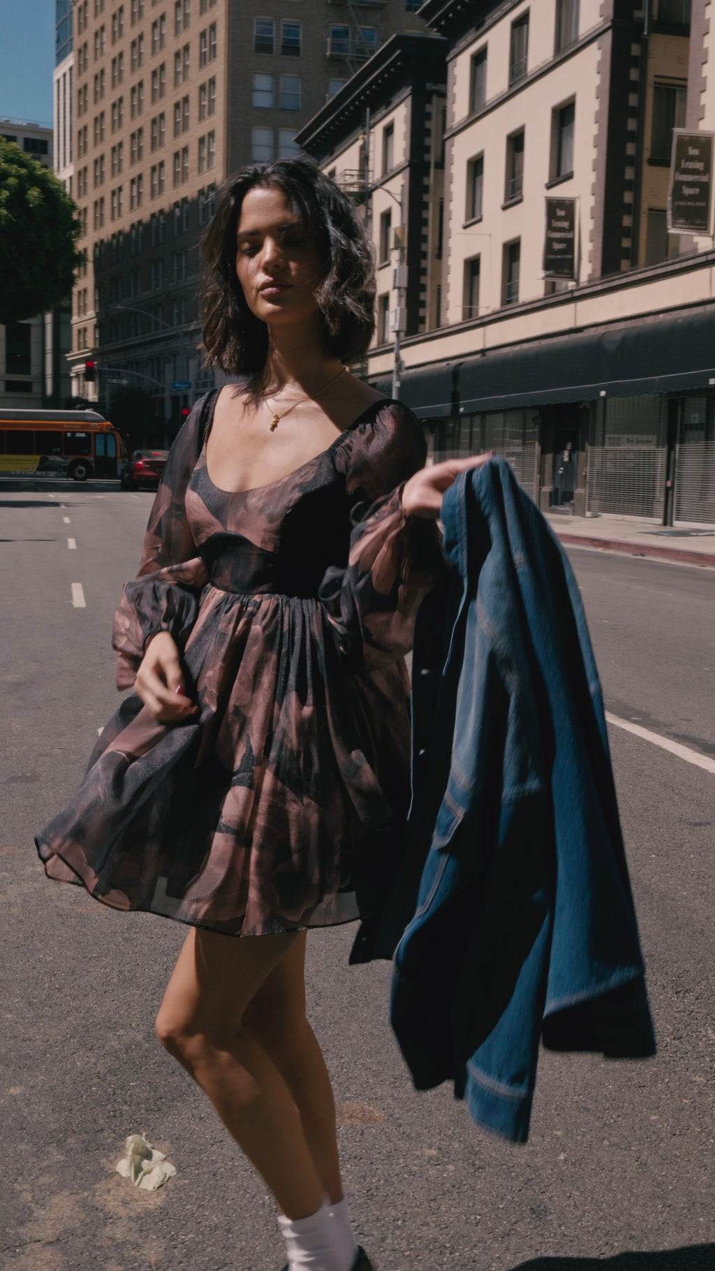 - Floral-print organza mini dress with the following features:
