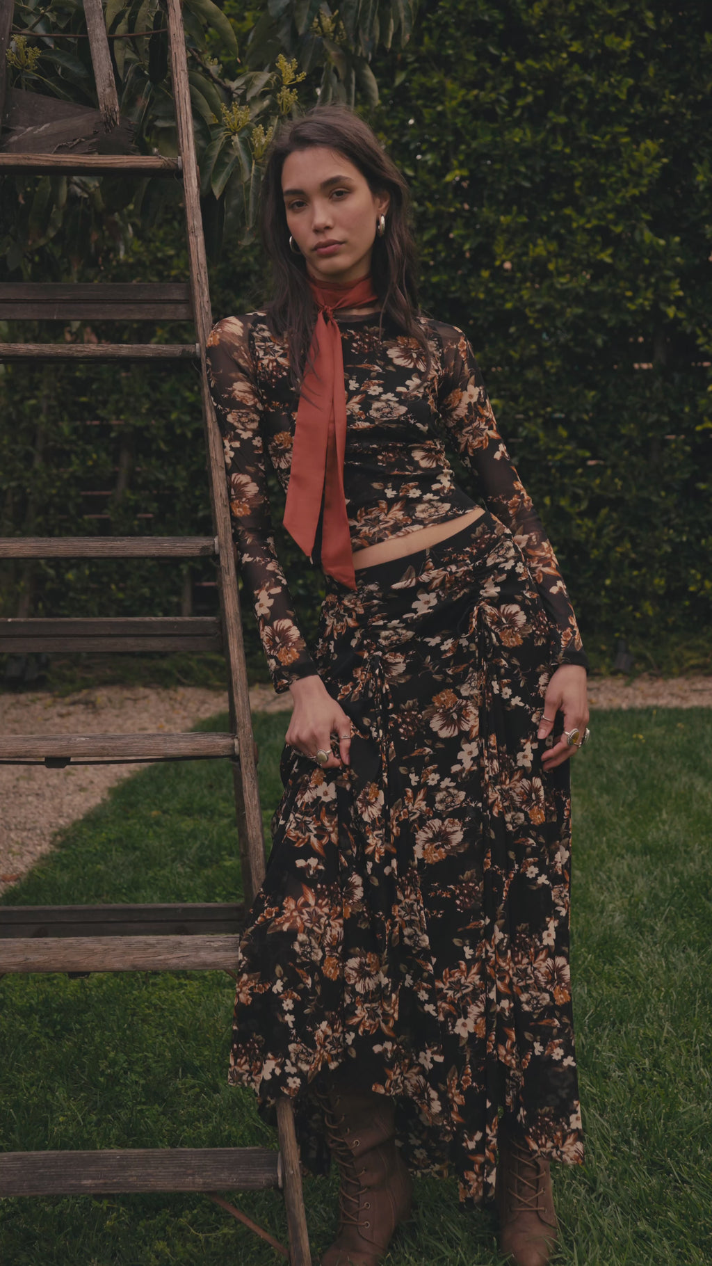 Forgotten Garden Floral Mesh Ruched Maxi Skirt