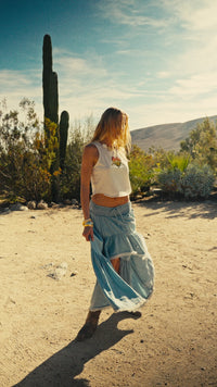 Breezy Sky Denim High-Low Tiered Ruffle Maxi Skirt