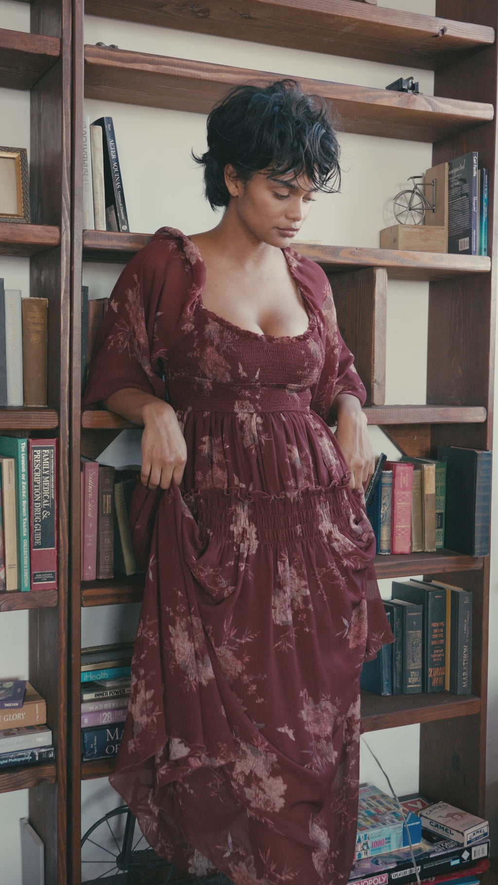 Delicate Blossoms Smocked Floral Chiffon Midi Dress