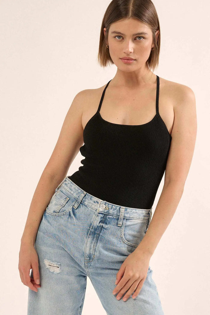 Shaper Fit Halter Rib-Knit Open-Back Tank Top