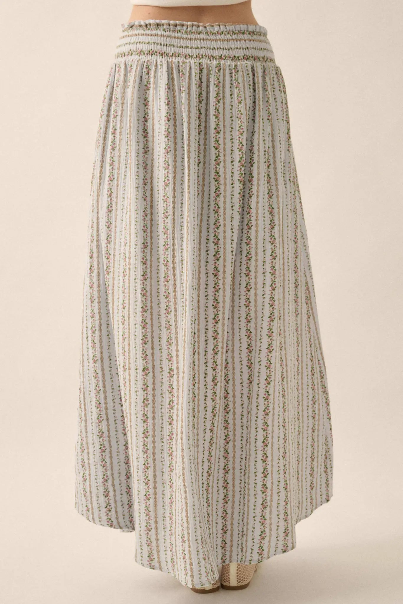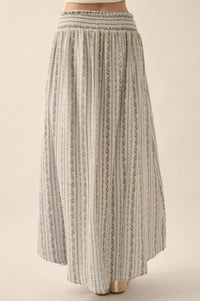 • Floral-stripe print crinkle cotton muslin maxi skirt.