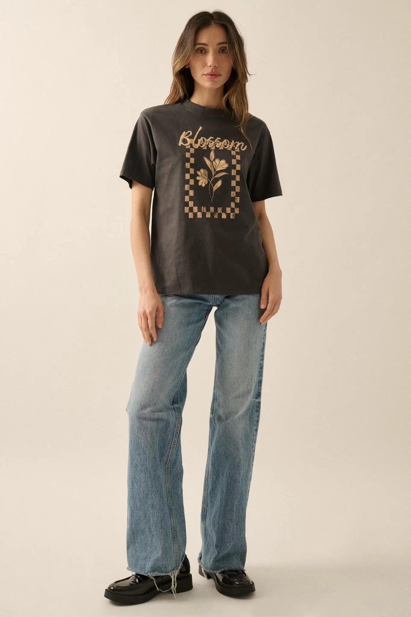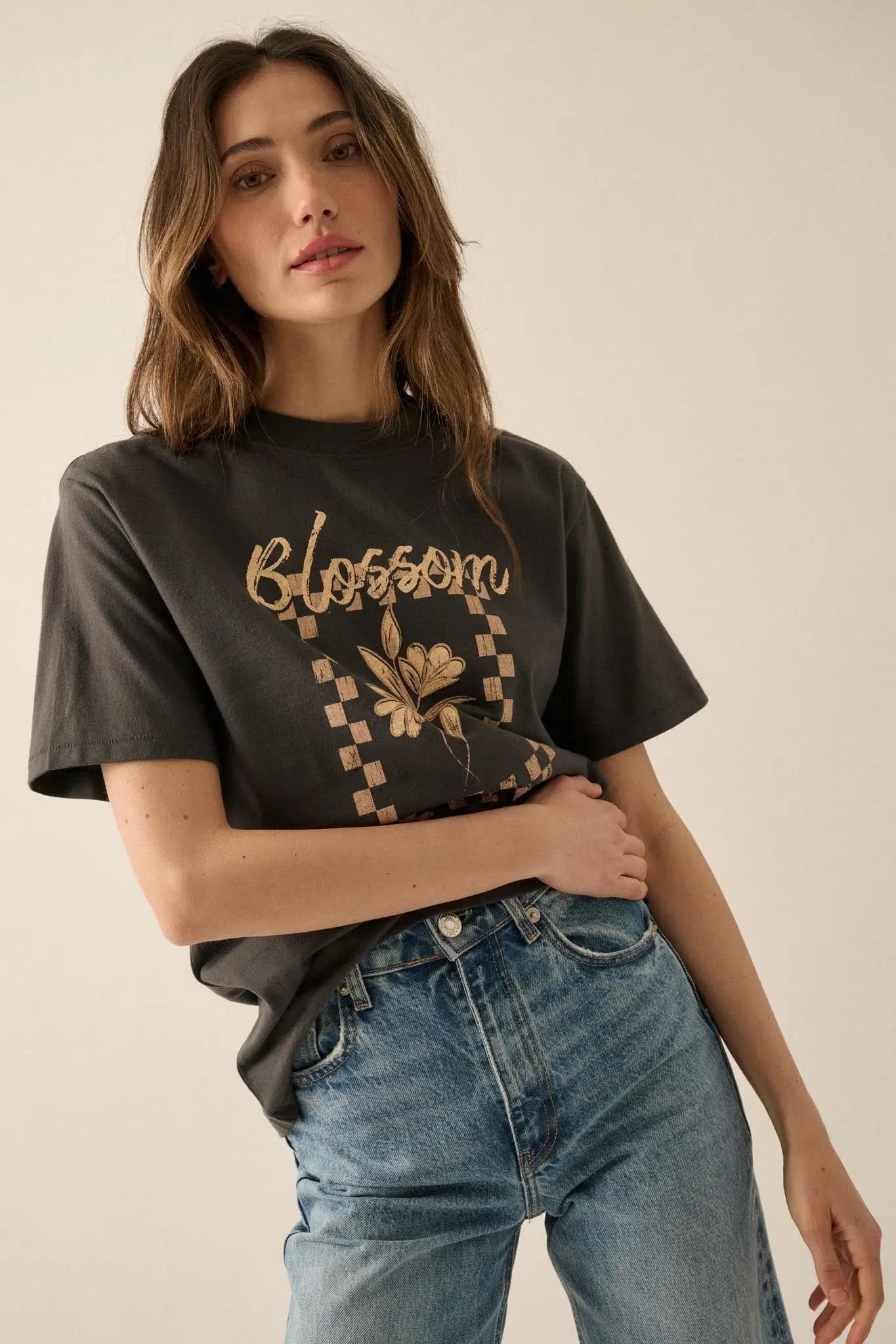 - Vintage-style floral graphic print with "Blossom" text.