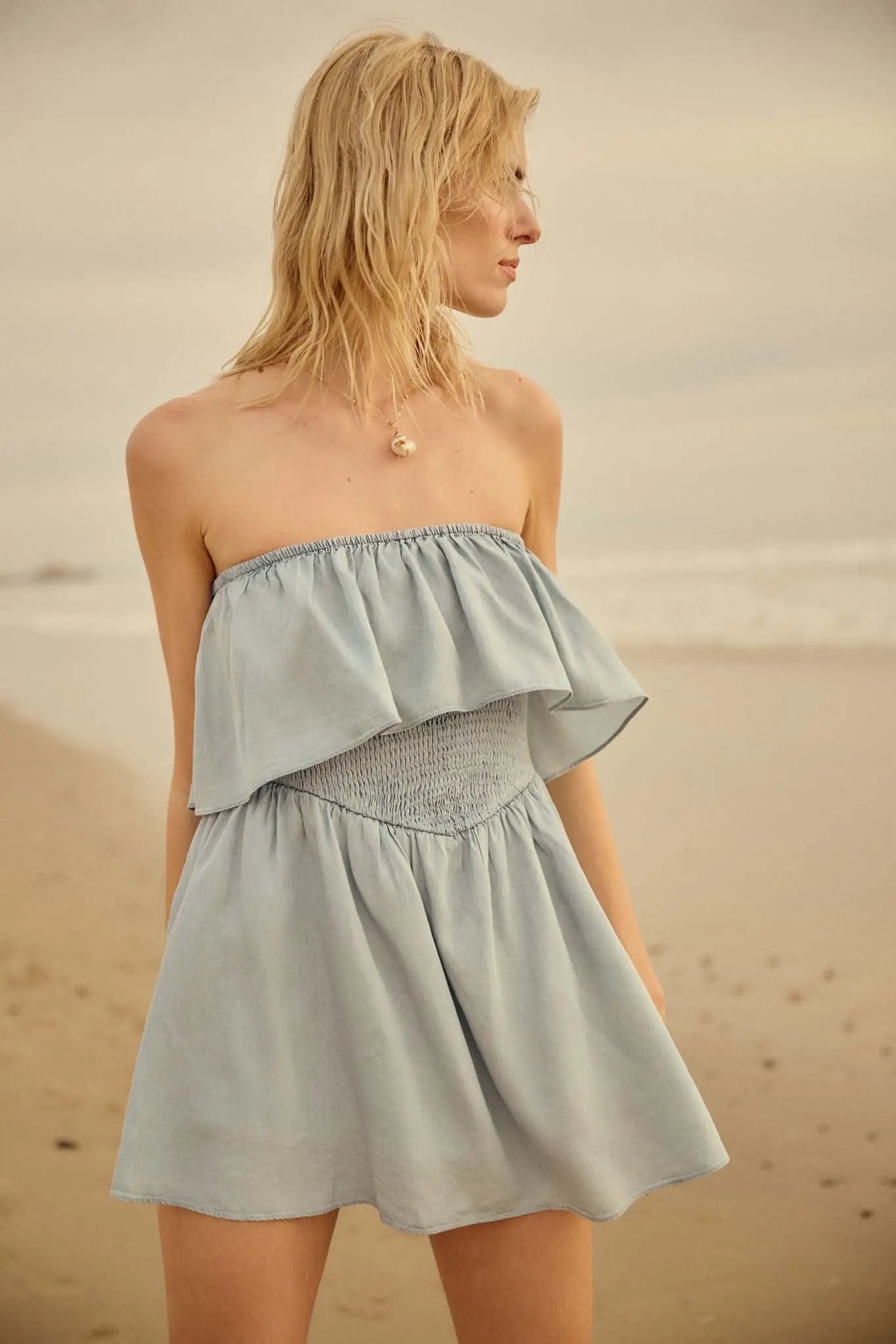 • Strapless neckline with flounce ruffle.