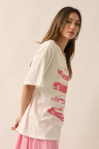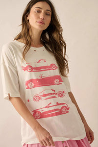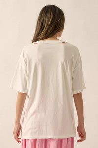 - Torn and distressed detailing at neckline, cuffs, and hem.