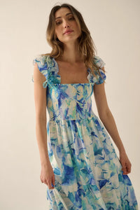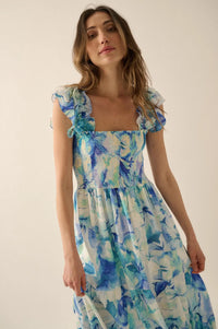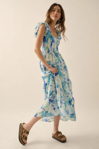 Cyan Blossoms Floral Smocked Ruffle Midi Dress