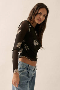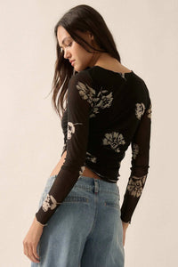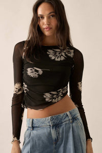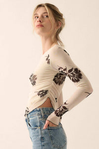 Deco Garden Floral Mesh Ruched Asymmetrical Top
