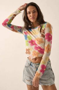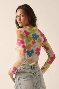 Flower Fest Floral Mesh Long-Sleeve V-Hem Top