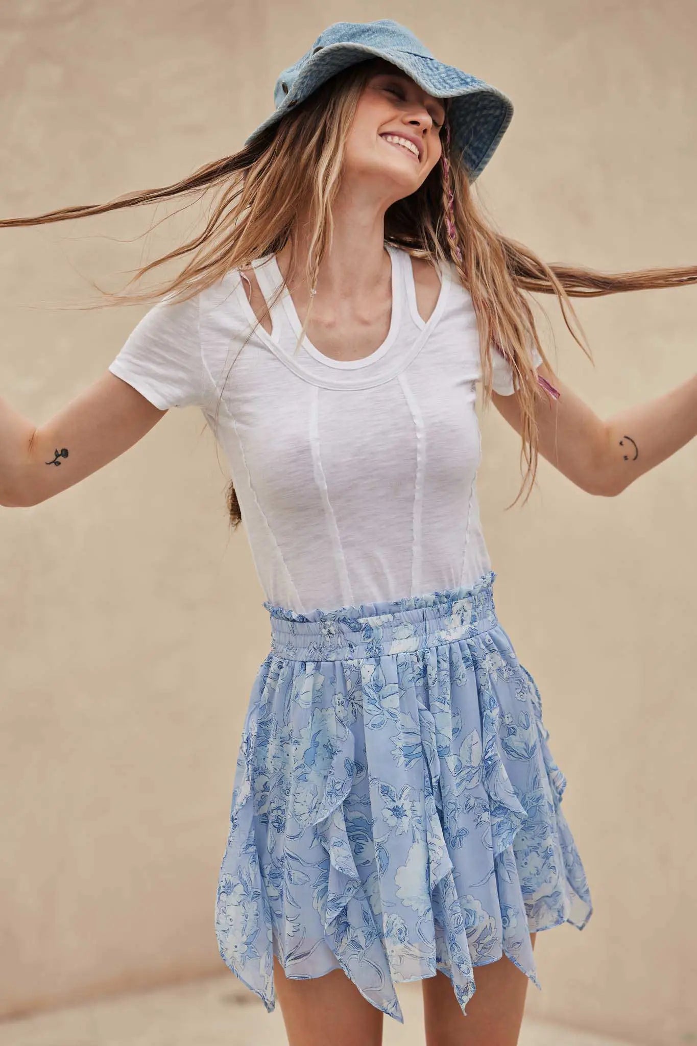 • Floral-print chiffon mini skirt.