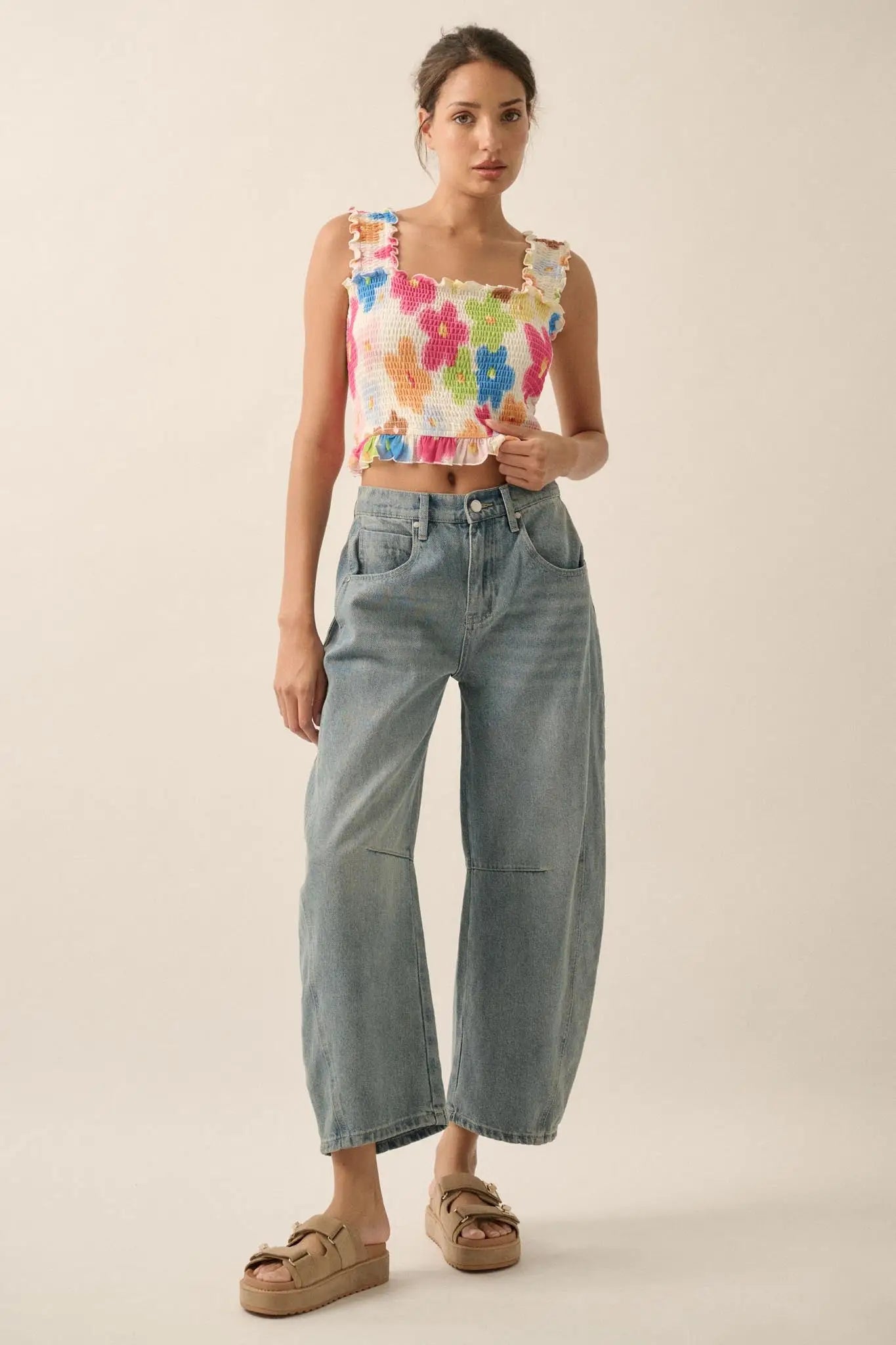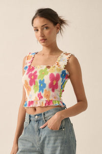 Funky Flowers Smocked Floral Mesh Ruffle Tank Top