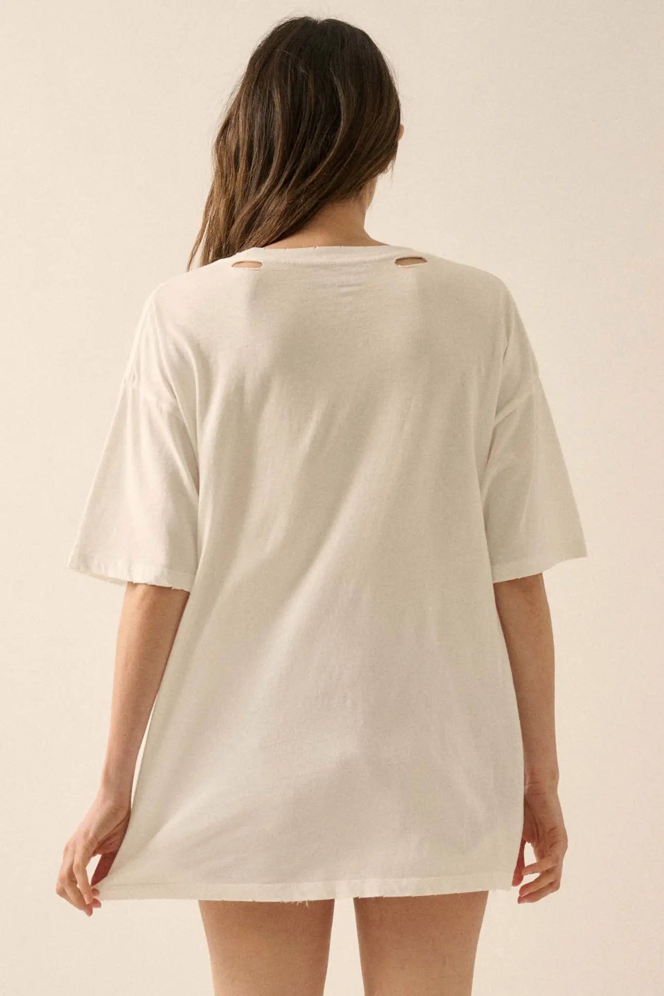 • Torn and distressed detailing at neckline, cuffs, and hem.