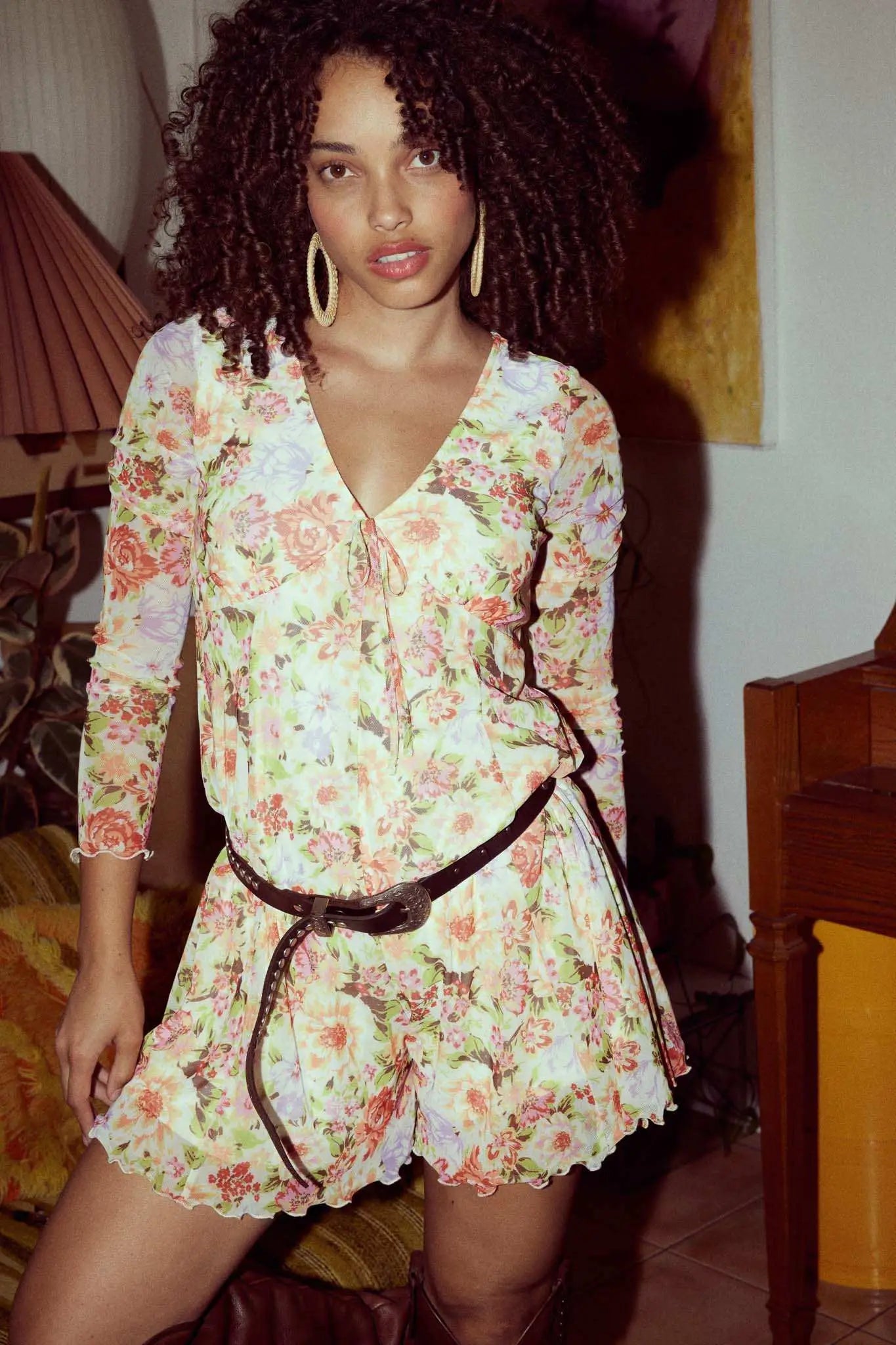- Floral-print mesh romper.