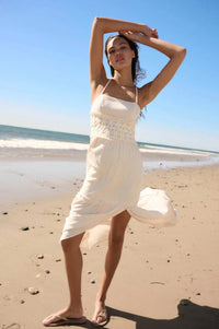 • Smocked elastic back with crisscross straps.