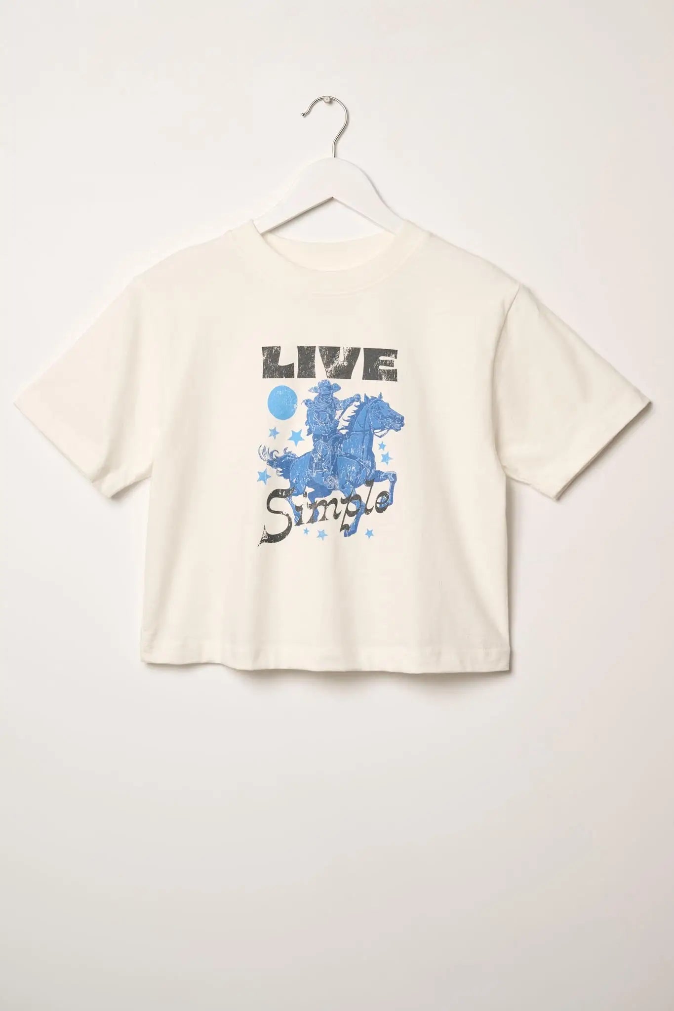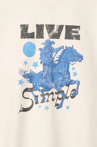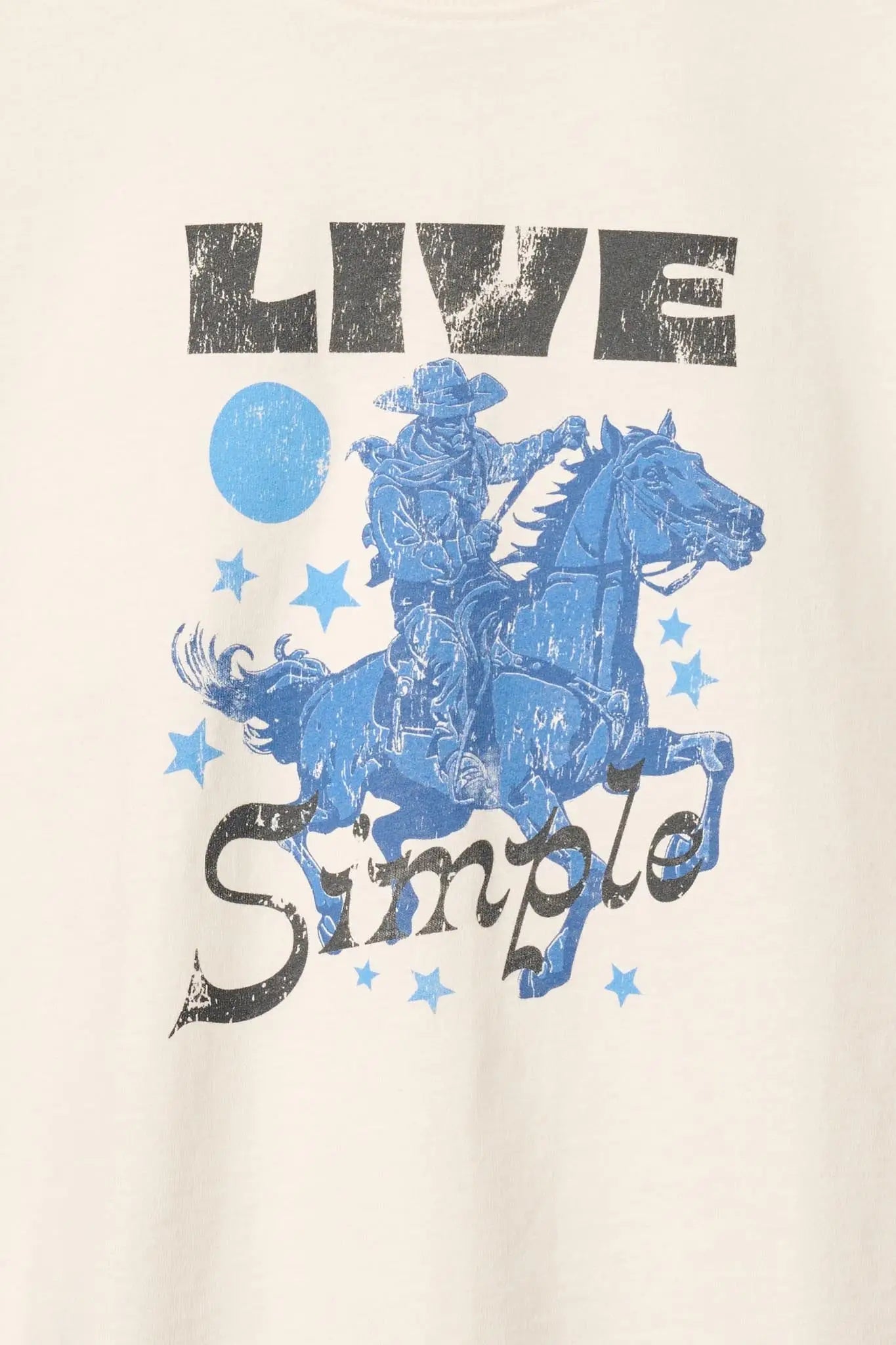 - Vintage-style cowboy graphic print with "Live Simple" text.