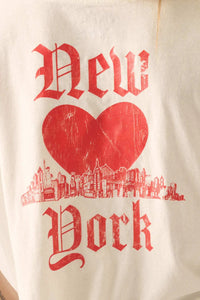 - Vintage-style back print with "New York" gothic text and heart and skyline graphics.