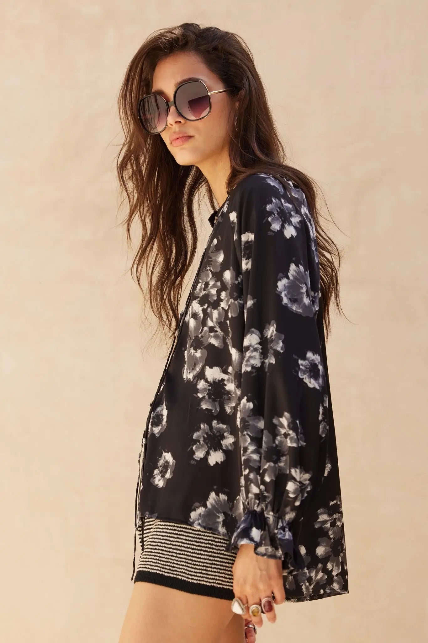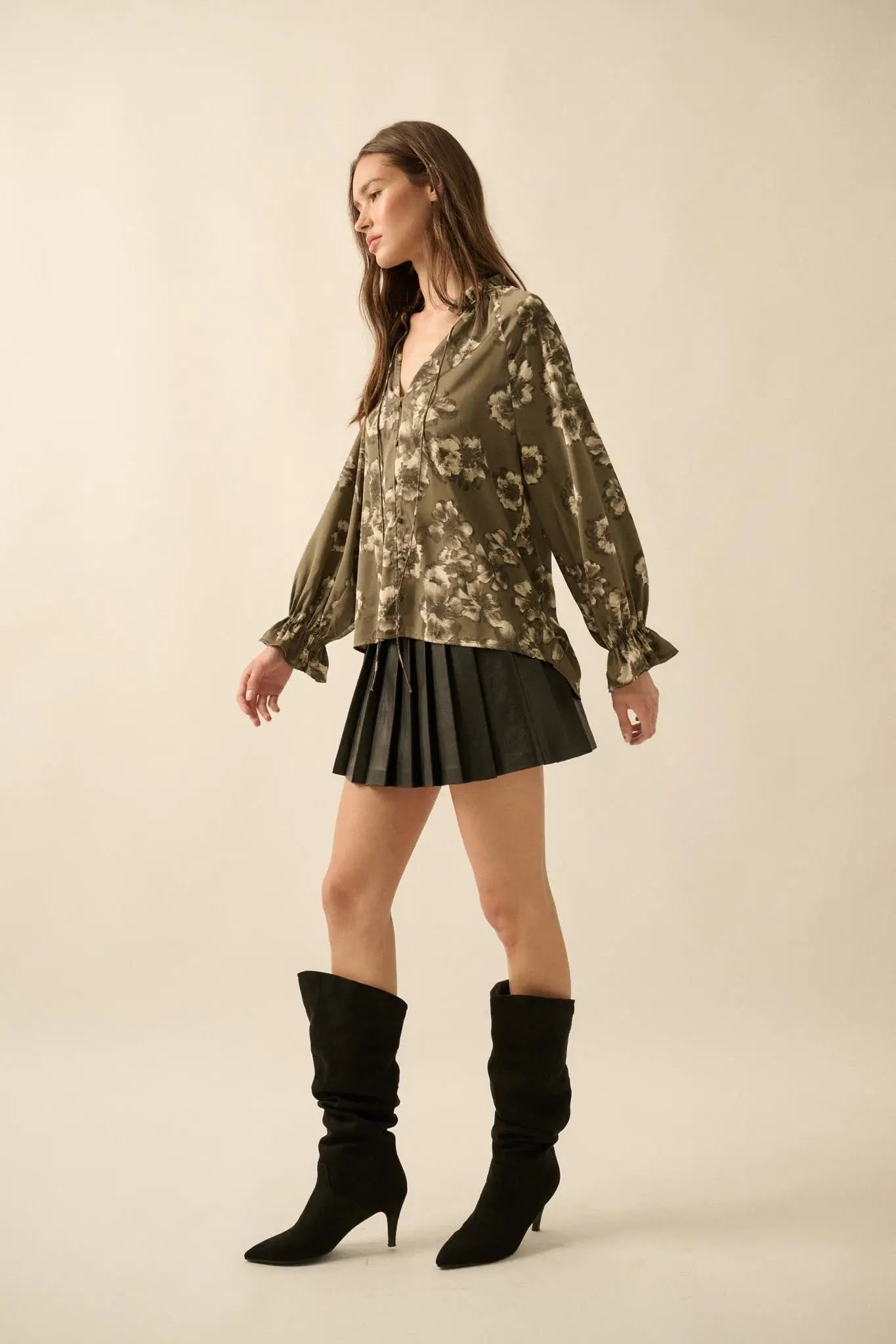 - Floral-print satin blouse.