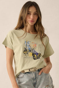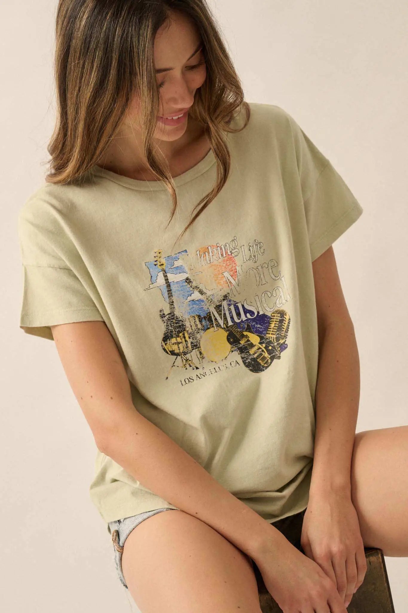 - Vintage-style graphic print with musical instruments and "Making Life More Musical" text.