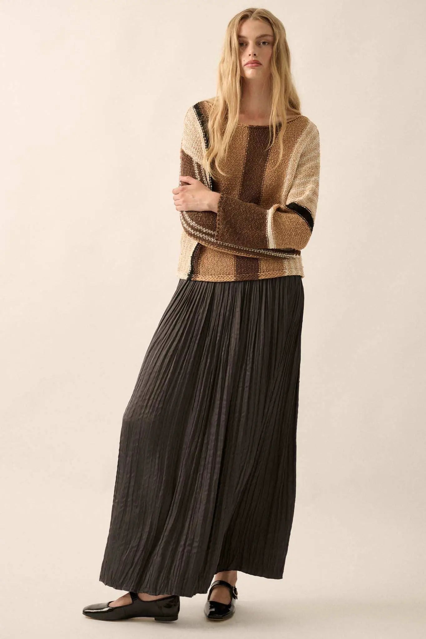 • Colorblock striped, textured knit sweater.