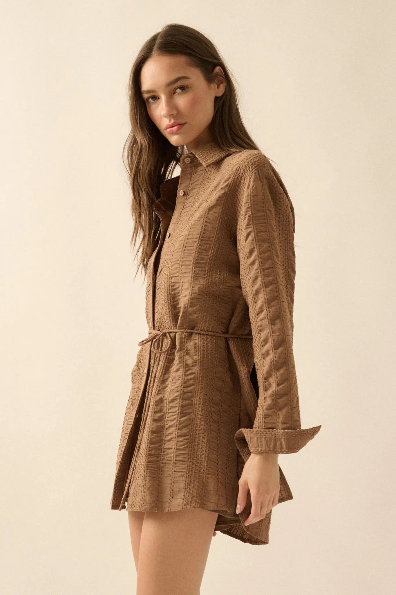 • Removable tie belt.