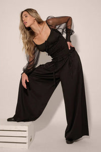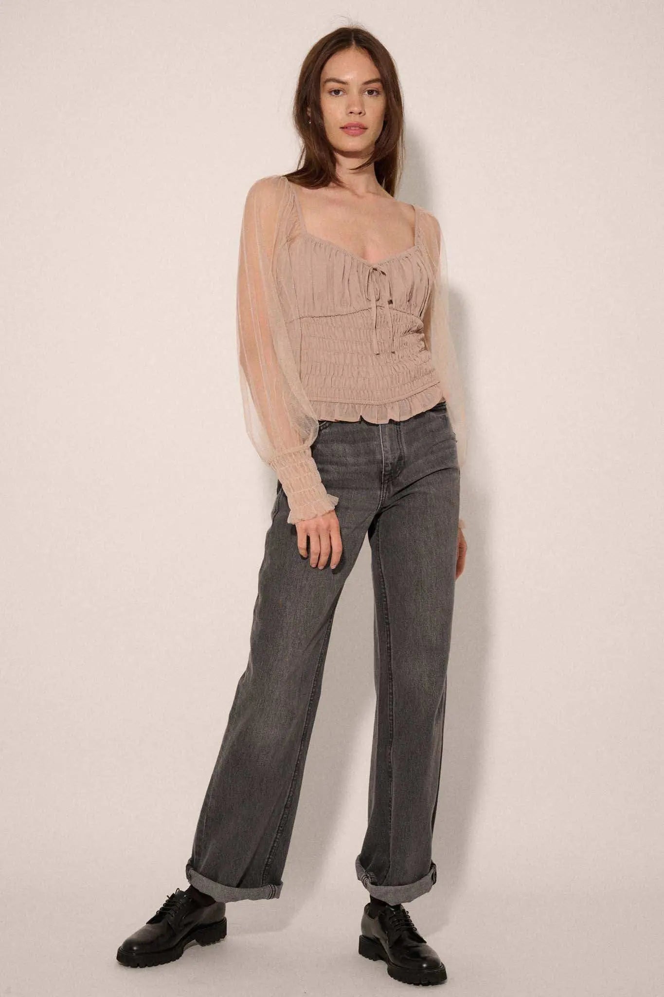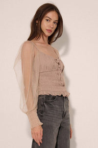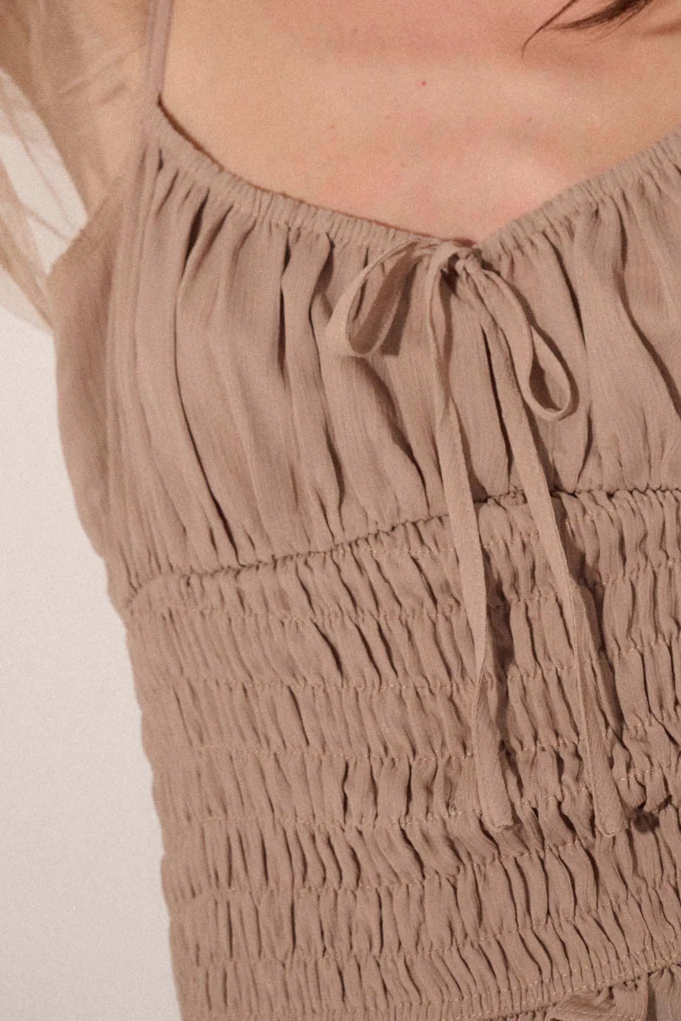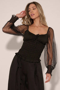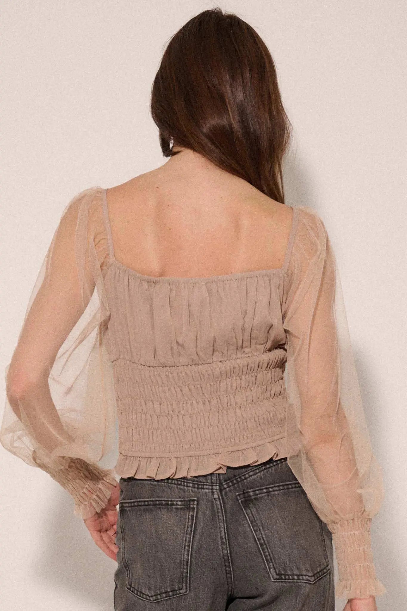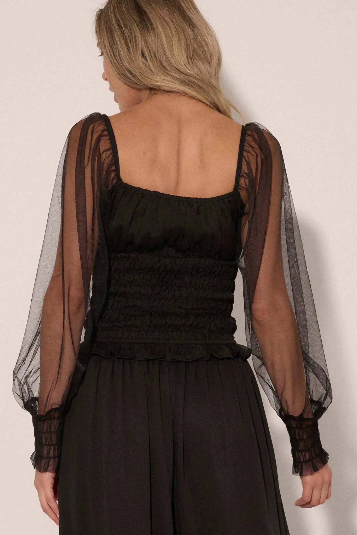 - Long sleeves in sheer tulle with smocked ruffle cuffs.