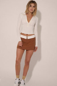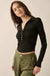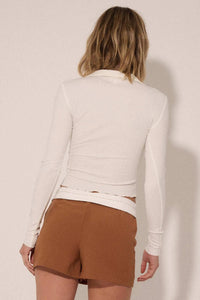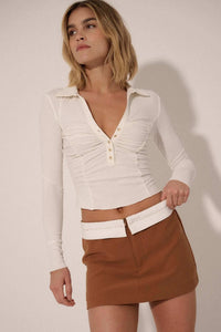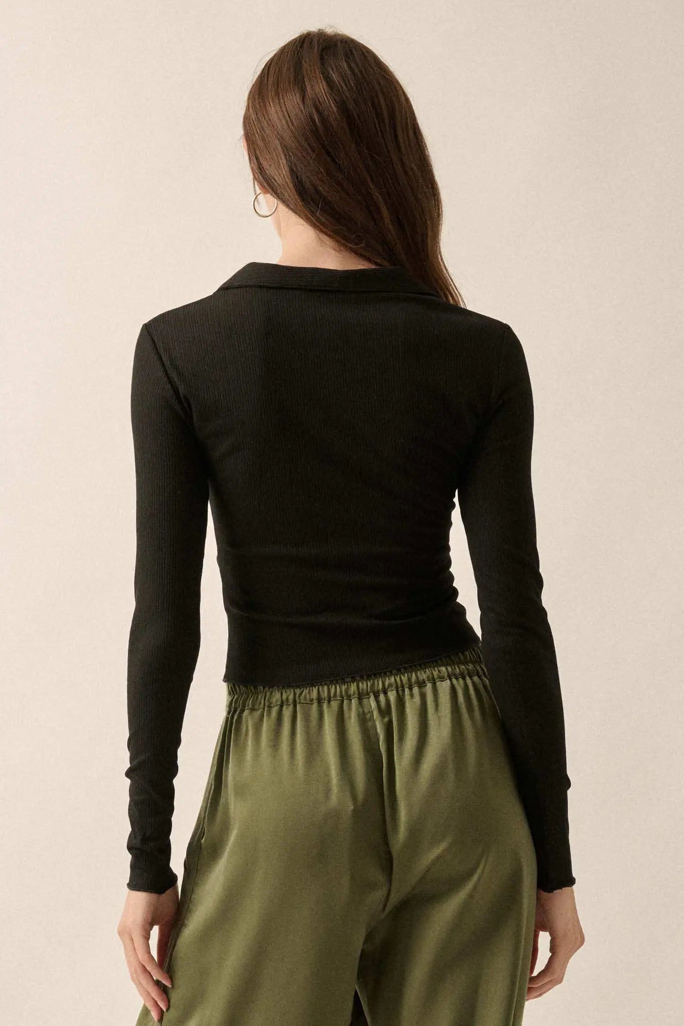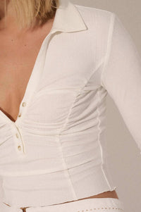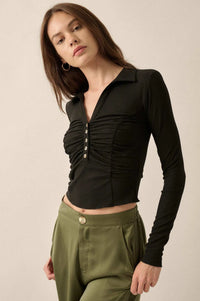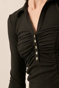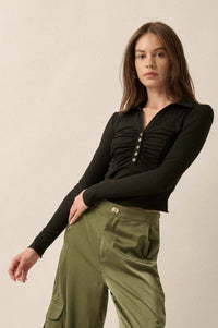Ribbed Knit Ruched Collared Henley Top - ShopPromesa