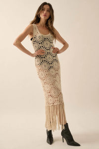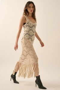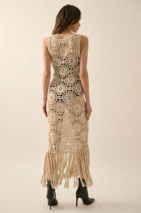 Rare Vintage Crochet Knit Fringe Maxi Dress