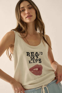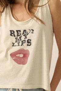 - Vintage-style "Read My Lips" text print with lips graphic.