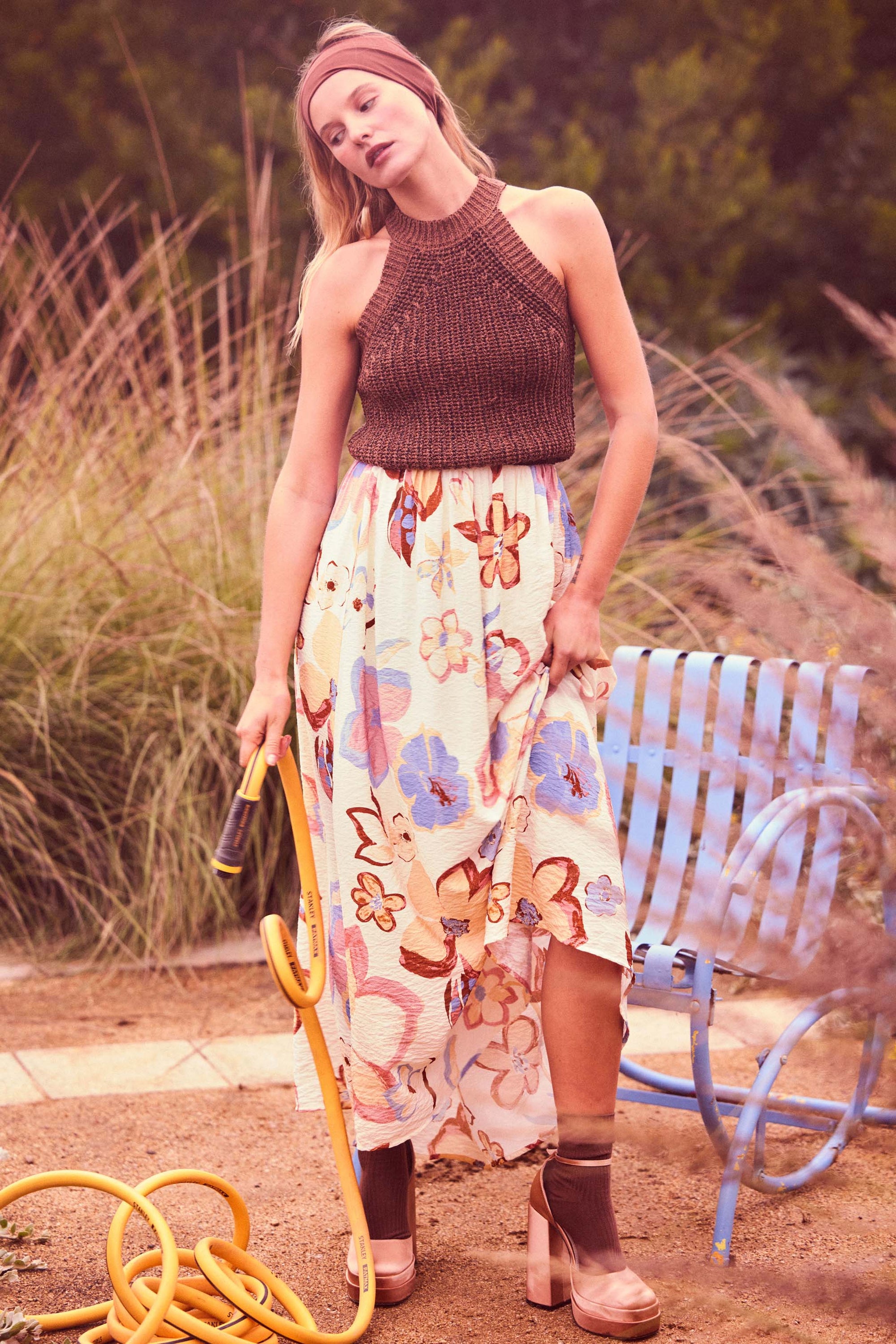- Textured floral-print maxi skirt.