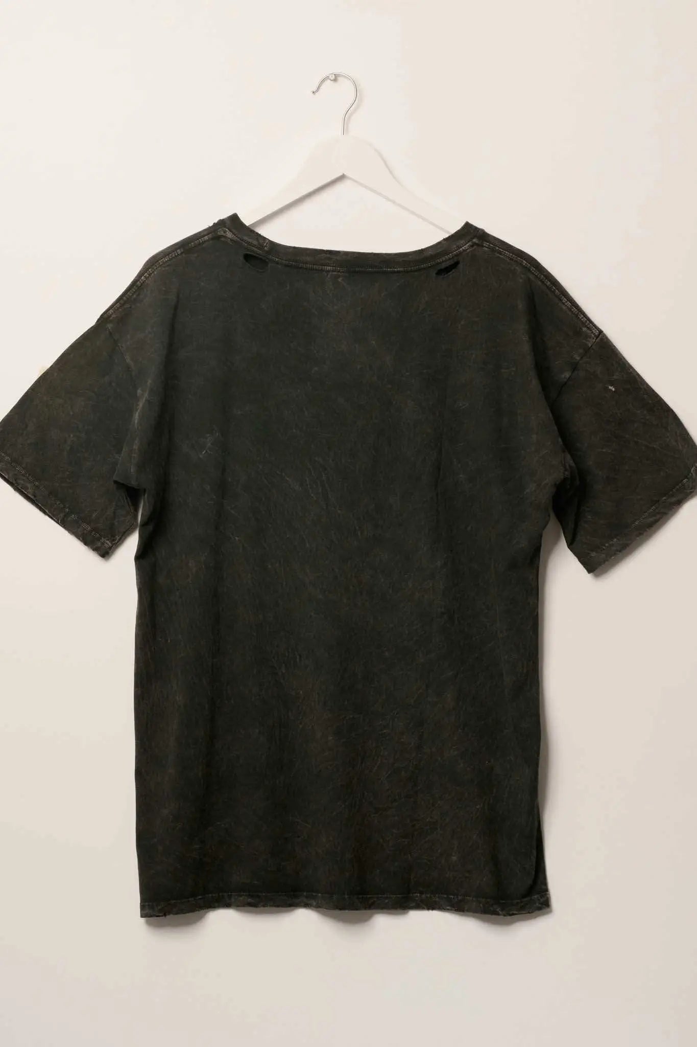 - Torn and distressed detailing at neckline, cuffs, and hem.