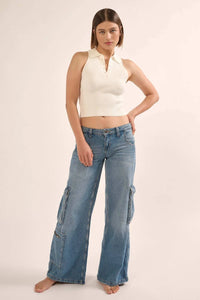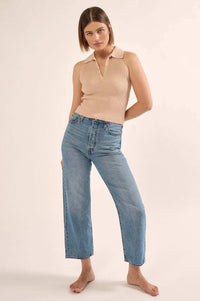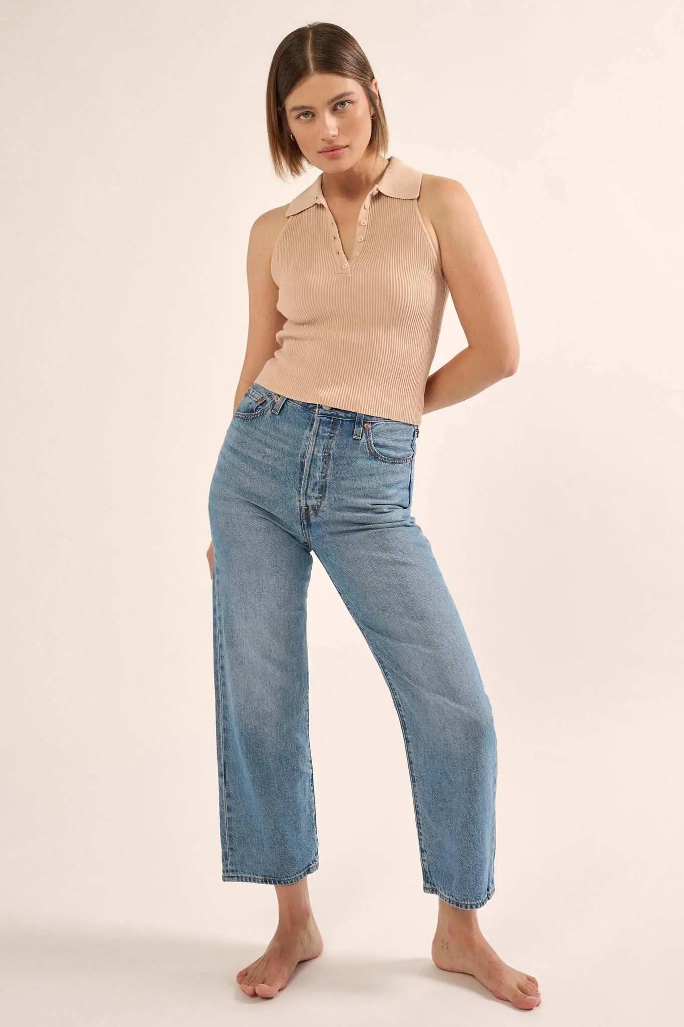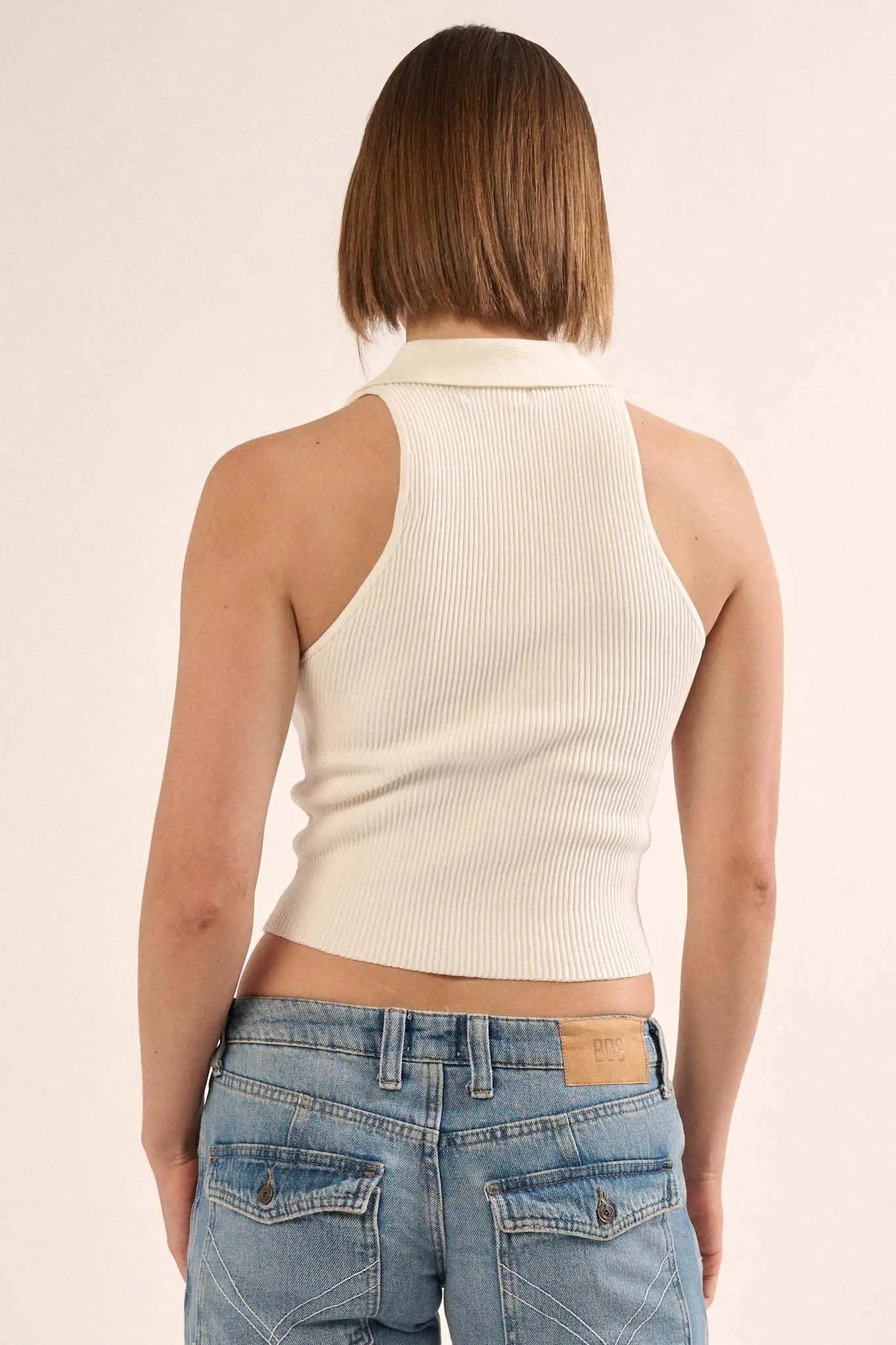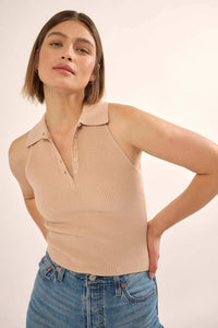 Shaper Fit Collared Rib-Knit Sleeveless Polo Top