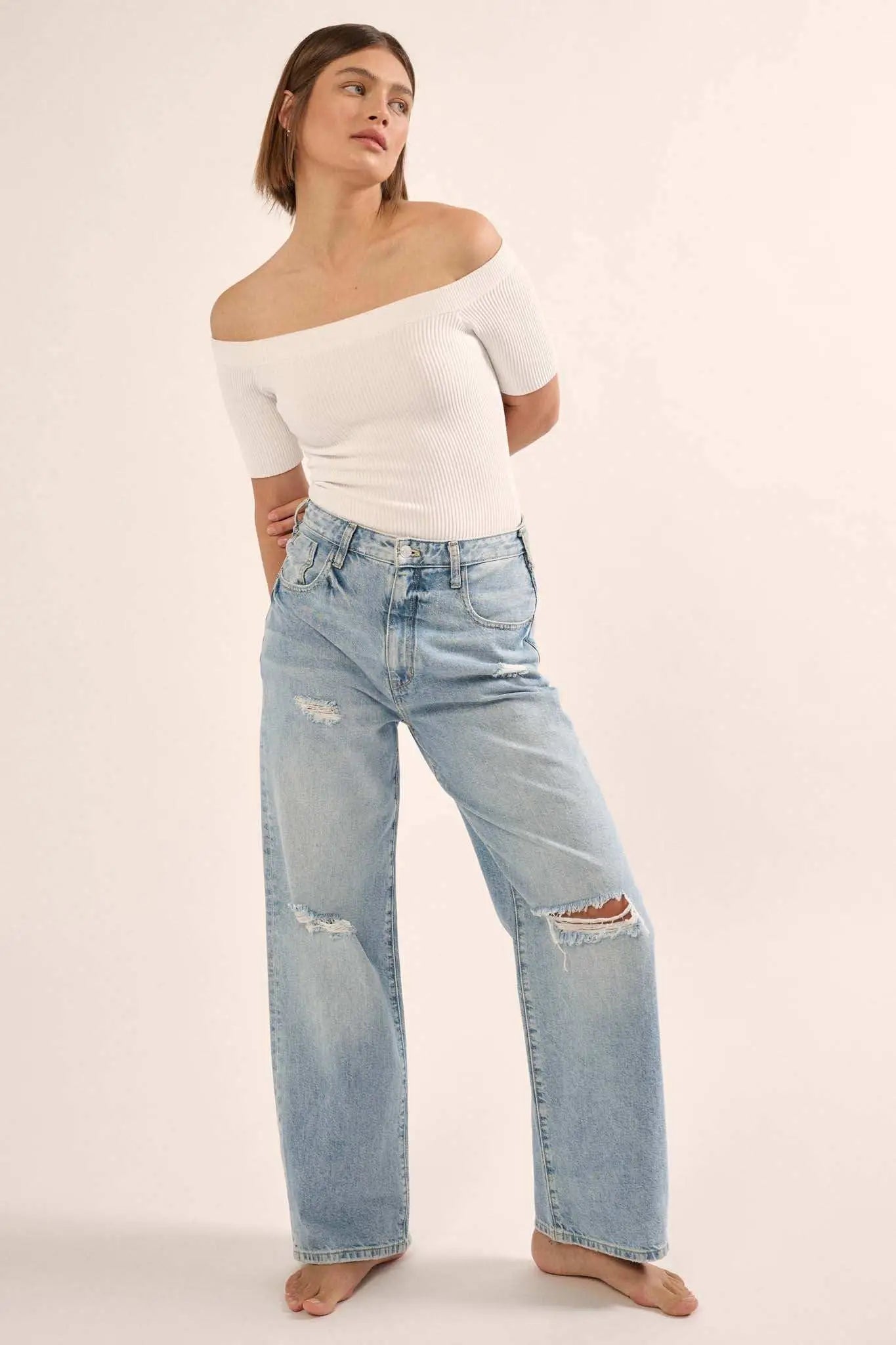 • Off-shoulder neckline with banded trim.
