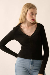 Shaper Fit Rib-Knit Split-Neck Long-Sleeve Top