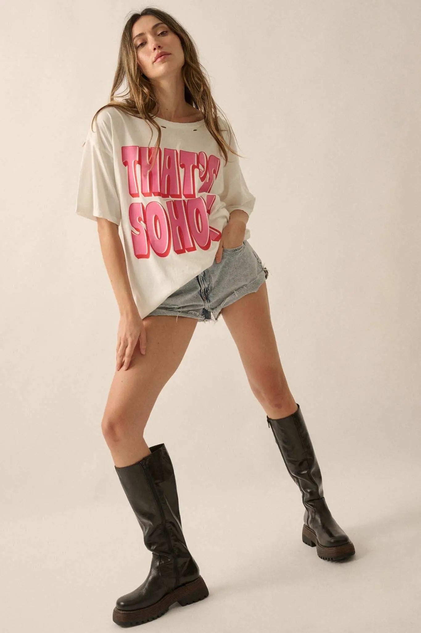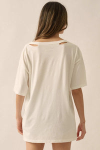 - Torn and distressed detailing at neckline, cuffs, and hem.