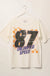 - Vintage-style "87 Unlimited Speed" text print with checker graphics.
