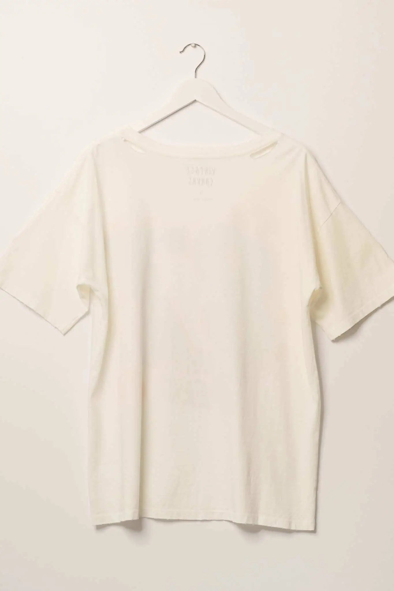 - Torn and distressed detailing at neckline, cuffs, and hem.
