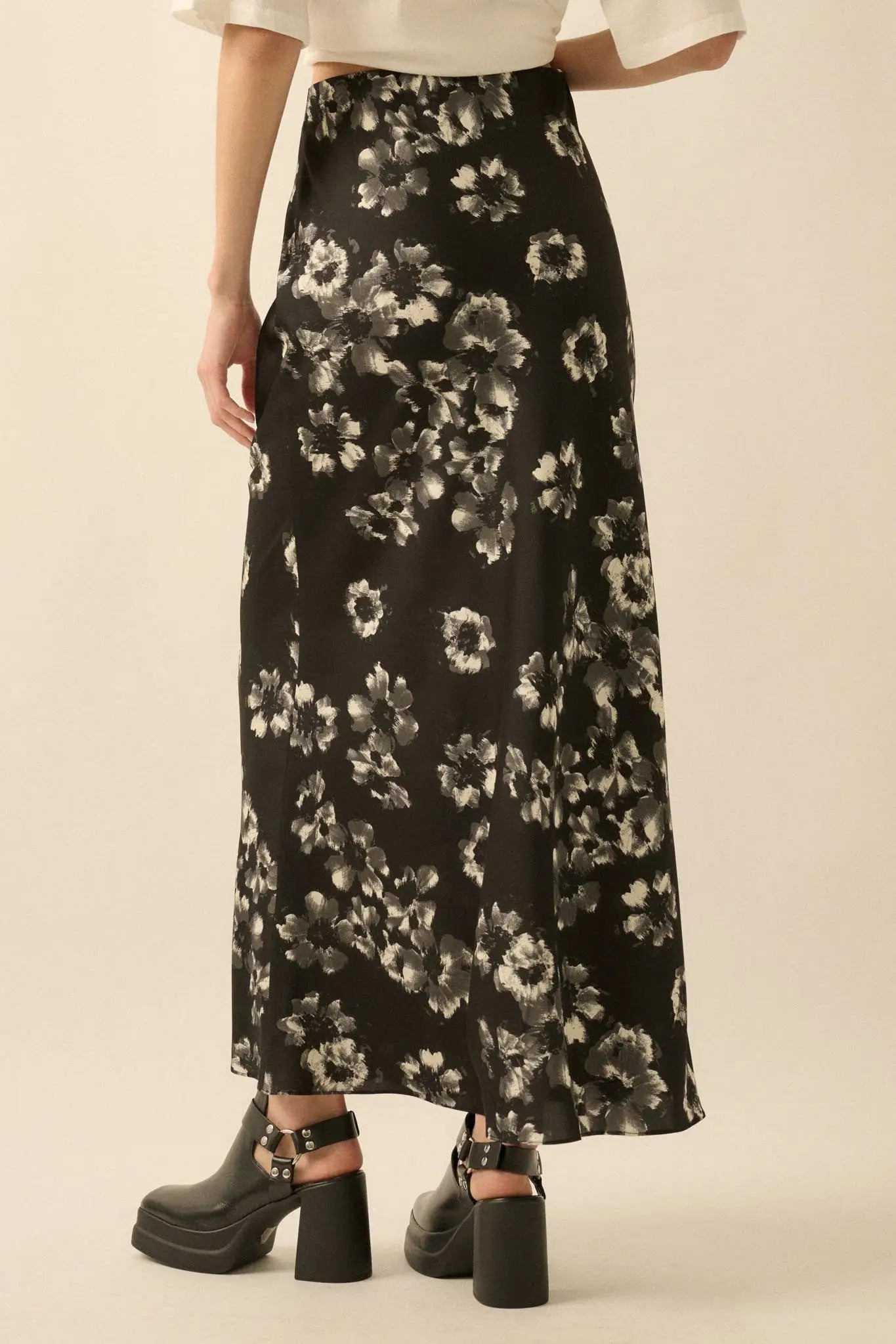 Whispering Petals Bias-Cut Floral Satin Maxi Skirt